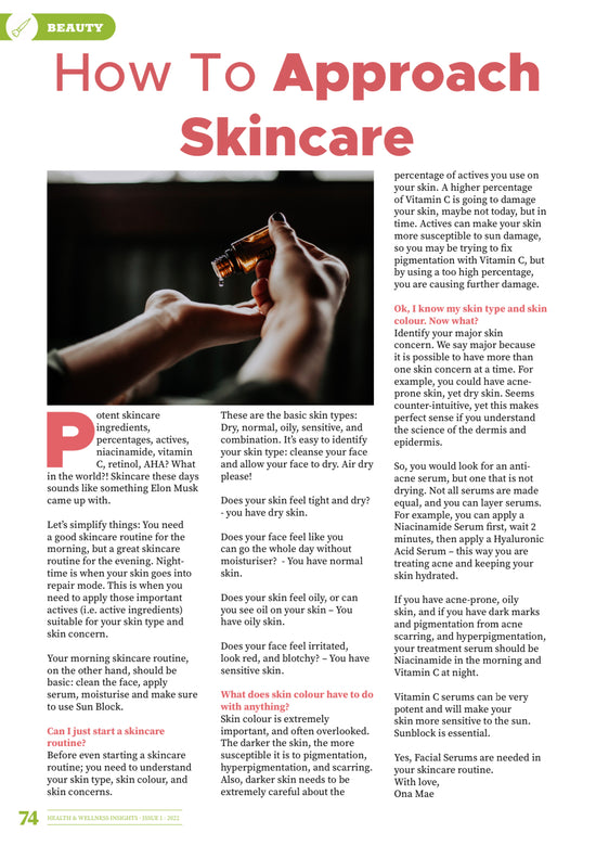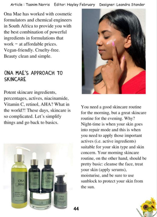 How to Apply SkincareDo you know how to apply your skincare products for oily and acne-prone skin?Recommended AM Routine:- Cleanse, lather your preferred cleanser, massage and rinse. Gently pat face dry. - Apply a few drops of Ona Mae Blemish Buster Niacinamide Serum, wait about 20seconds. - Apply Ona Mae Anti-aging Peptide Face Lotion - Ensure that you apply Sunblock, everyday. SPR 50 is ideal. Recommended PM Routine:- Cleanse, lather your preferred cleanser, massage and rinse. Gently pat face dry. - Apply a few drops of Ona Mae Super-Charged Vitamin C Serum, wait about 20seconds. - Apply Ona Mae Anti-aging Peptide Face Lotion * Starting with once a week, & increasing to a maximum 3 times a week, swap the Super-Charged Vitamin C Serum for the Glow on then Vitamin A Serum. (*N.B. Do Not apply Super-Charged Vitamin C Serum and Glow on Then Vitamin A Serum in the same routine).